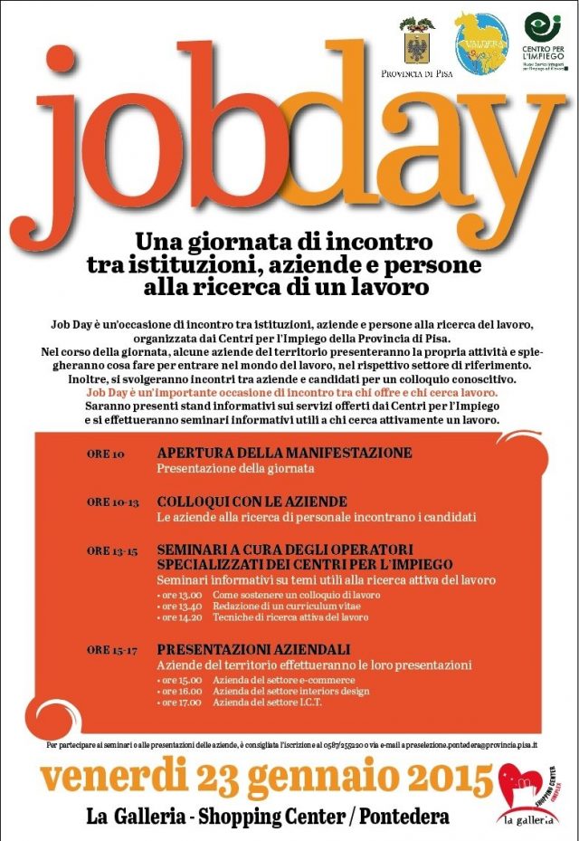 In sinergia con la Galleria Shopping center/Cineplex di Pontedera, luogo deputato all’intrattenimento e allo shopping, verrà ospitato nei suoi locali il "JOBDAY", giornata dedicata al tema del lavoro. Offrire questo tipo di servizio informativo in un luogo molto frequentato da giovani e famiglie costituisce un’opportunità, per la Galleria Shopping center/Cineplex, di dare un’attenzione in più alle problematiche dei propri clienti/utenti e, per i Centri per l’Impiego, di entrare in contatto con utenti ai quali, molto spesso, mancano nozioni di base per andare alla ricerca di un lavoro. Anche le aziende presenti all’interno del Centro Commerciale potranno usufruire della consulenza degli addetti del CENTRO PER L’IMPIEGO per cercare di districarsi nelle nuove normative contrattuali e per dare la possibilità di impiegare personale adatto alle proprie caratteristiche aziendali.