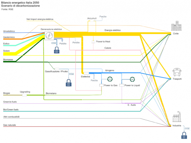 «Un cardine dello Scenario di decarbonizzazione – si legge nella Strategia nazionale – è il forte incremento del fabbisogno di elettricità fino a circa 650 TWh, più del doppio rispetto ai livelli attuali. Questo vero e proprio “shock elettrico” si accompagna ad una rivoluzione sia in termini di “generazione” che in termini di “impiego”. Dal primo punto di vista, l’obiettivo di fondo è che il settore energetico arrivi ad azzerare le sue emissioni, se non a portarle addirittura in territorio negativo. Questo implica che la generazione elettrica sia assicurata tra il 95% e il 100% da fonti rinnovabili, a seconda che si conservi o meno un residuo di gas naturale (comunque integrato da sistemi di cattura e stoccaggio della CO2). Basandosi sulle ipotesi tecnicamente percorribili con le conoscenze attuali, ne esce un quadro dominato dalla produzione eolica e soprattutto solare, cui si somma il mantenimento delle fonti tradizionali (idroelettrico) e la crescita di quelle oggi relativamente sfruttate poco (geotermico) o per nulla (maree e moto ondoso)».