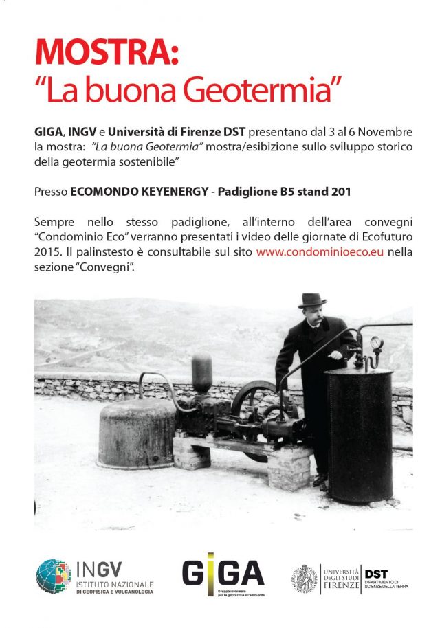 Ad illustrare al grande pubblico i tanti volti di questa insospettabile fonte energetica, un pò nascosta solo per il fatto di stare sotto i nostri piedi, tre organizzazioni nazionali che da anni si battono per una nuova geotermia davvero degna dell’appellativo di rinnovabile come la nostra l’Associazione GIGA, INGV (Istituto Nazionale di Geofisica e Vulcanologia) e il Dipartimento di Scienze della Terra dell’Università di FirenzeDue eventi di grande spessore in Ecomondo Key Energy, come la mostra dal titolo ”La Buona Geotermia”, che spiegherà in maniera molto divulgativa al grande pubblico della manifestazione riminese, come  ha origine la Geotermia e come il genere umano  ha imparato nei millenni ad utilizzarla, a partire dalle caverne, attraverso le acque calde ed il termalismo, per arrivare ai giorni nostri dopo la svolta del primo 900 con l’invenzione tutta italiana della geotermia per la produzione di energia elettrica ad opera di Ginori Conti. Una mostra che illustra i vari impieghi dalle basse alle medie e alte temperature con le pompe di calore, la micro geotermia, i cicli binari per le medie alte entalpie e con il rendering della nuova centrale a reimmissione totale proposta dalla Rete Geotermica Italiana. Si tratta della “Buona Geotermia“, in pace con l’ambiente e il paesaggio e con lo sviluppo del dialogo tecnologico, sociale e politico avviato con gli incontri della “Carta di Abbadia San Salvatore“, e sulla base dei quali le associazioni e le istituzioni scientifiche organizzatrici della mostra si augurano di avere finalmente scritto basi comuni per definire finalmente una geotermia socialmente accettata perché ecologicamente evoluta.