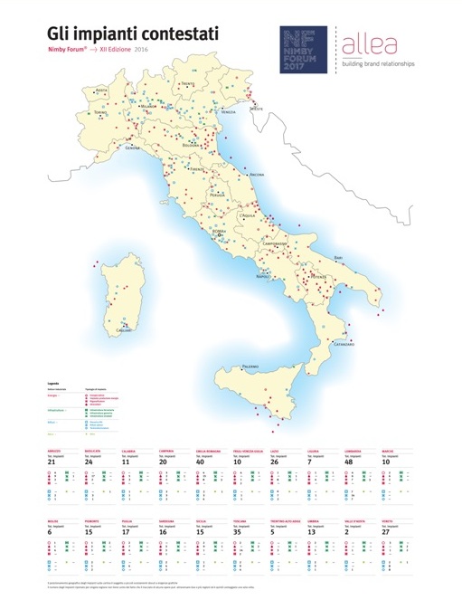L’Osservatorio media permanente Nimby forum è l’unico database nazionale che dal 2004 monitora in maniera puntuale la situazione delle opposizioni contro opere di pubblica utilità e insediamenti industriali in costruzione o ancora in progetto, monitoraggio che è stato cristallizzato poche settimane fa nel XII rapporto annuale, aggiornato con dati 2016.