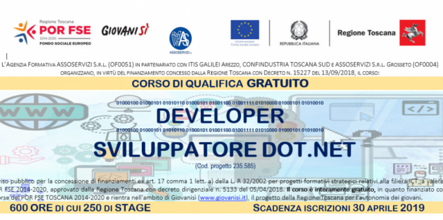 Sono aperte fino a martedì 30 aprile le iscrizioni al corso di formazione Qualifica Tecnico “Sviluppatore Dot.Net”, finanziato dalla Regione Toscana con Decr. N.15227 del 13/09/2018. Il corso gratuito è organizzato da Assoservizi, l’agenzia formativa di Confindustria Toscana Sud. I posti disponibili sono 12, la sede di svolgimento Siena…continua