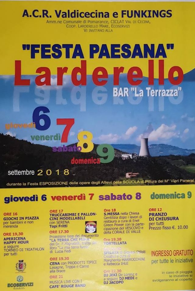 Home Cosvig Larderello: Festa Paesana CosvigGeotermia NewsDigest Larderello: Festa Paesana Di DrWolf - 3 Settembre 2018 1088 0 CONDIVIDI Facebook Twitter Bar “La Terrazza” dal 6 al 9 Settembre Fonte: UTC Castelnuovo Val di Cecina Autore: UTC Castelnuovo Val di Cecina ACR Valdicecina e Funkings, Amm.ne Comunale di Pomarance, CICLAT Val di Cecina, Coop. Larderello Mare, Ecoservizi invitano alla FESTA PAESANA DI LARDERELLO che si terrà presso il Bar "La Terrazza" il 6-7-8-9 Settembre.