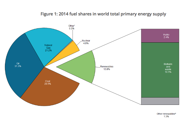 Secondo gli ultimi dati pubblicati dall’Agenzia Internazionale dell’Energia (IEA), infatti, si vede che le rinnovabili, nel 2014, coprivano il 13,8% delle forniture globali di energia primaria, grazie soprattutto all’apporto di biofuel e biomasse solide, come la legna da ardere ampiamente sfruttata in vaste zone rurali dell’Africa e dell’Asia.