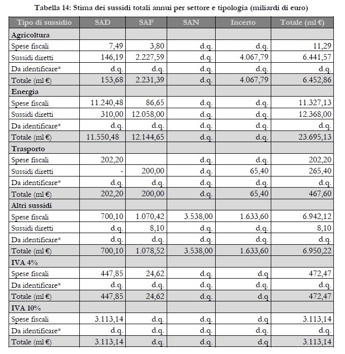 «Si tratta di oltre 41 miliardi di euro di sussidi, circa il 2,5% del Pil nazionale, di cui 9 Mld€ classificati come incerti o neutri, mentre i 32 Mld€ rimanenti si dividono circa a metà», tra sussidi ambientalmente favorevoli (Saf) e sussidi ambientalmente dannosi (Sad). Per l’esattezza questi ultimi sono i maggiori: 16,1 contro 15,7 miliardi di euro. In altre parole, lo Stato sostiene le attività dannose per l’ambiente più di quanto non faccia con quelle pulite.