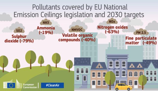 La nuova direttiva sui limiti nazionali di emissione fissa soglie massime annue di emissione per ciascun paese in relazione ai cinque principali inquinanti: particolato fine (PM2,5), anidride solforosa, ossidi di azoto, composti organici volatili non metanici e ammoniaca.