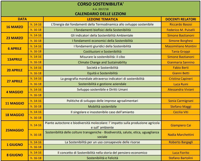 Assolutamente innovativo nel sistema universitario italiano, l’insegnamento, strutturato in 24 lezioni, è organizzato secondo un approccio transdisciplinare che attraversa aspetti ambientali, economici, giuridici, energetici, urbanistici, sociologici. Tra i docenti protagonisti spiccano tre firme del think tank di greenreport: l’economista Simone Borghesi, che terrà la lezione I fondamenti economici della sostenibilità; il giurista Massimiliano Montini, con la sua I fondamenti giuridici della sostenibilità, e il chimico ambientale Federico Maria Pulselli con I fondamenti biofisici della sostenibilità.