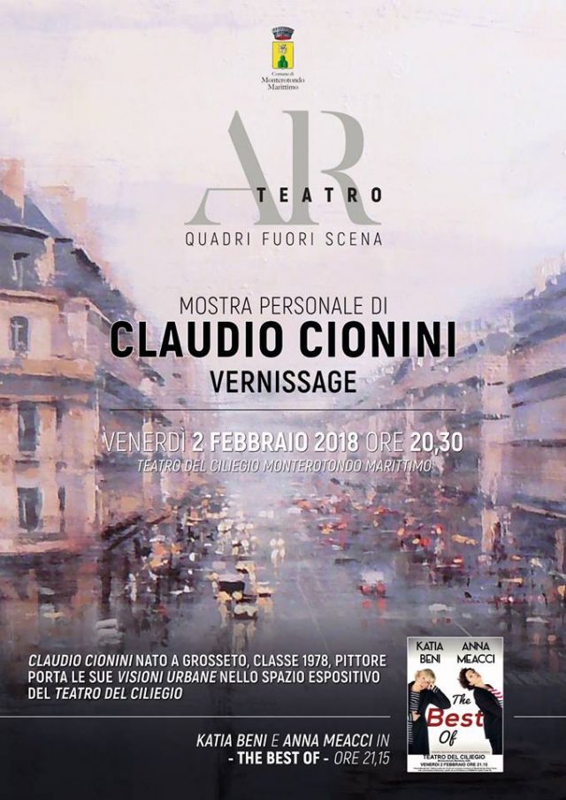 Ar-teatro, quadri fuori scena: venerdì 2 febbraio, alle 20 e 30, al teatro del Ciliegio di Monterotondo Marittimo, vernissage della personale di Claudio Cionini, pittore grossetano di raffinata maestria. La mostra apre in occasione dello spettacolo teatrale The Best Of, con Katia Beni e Anna Meacci, e sarà visitabile fino a mercoledì 21 febbraio, dal lunedì al sabato, dalle 15 alle 18.