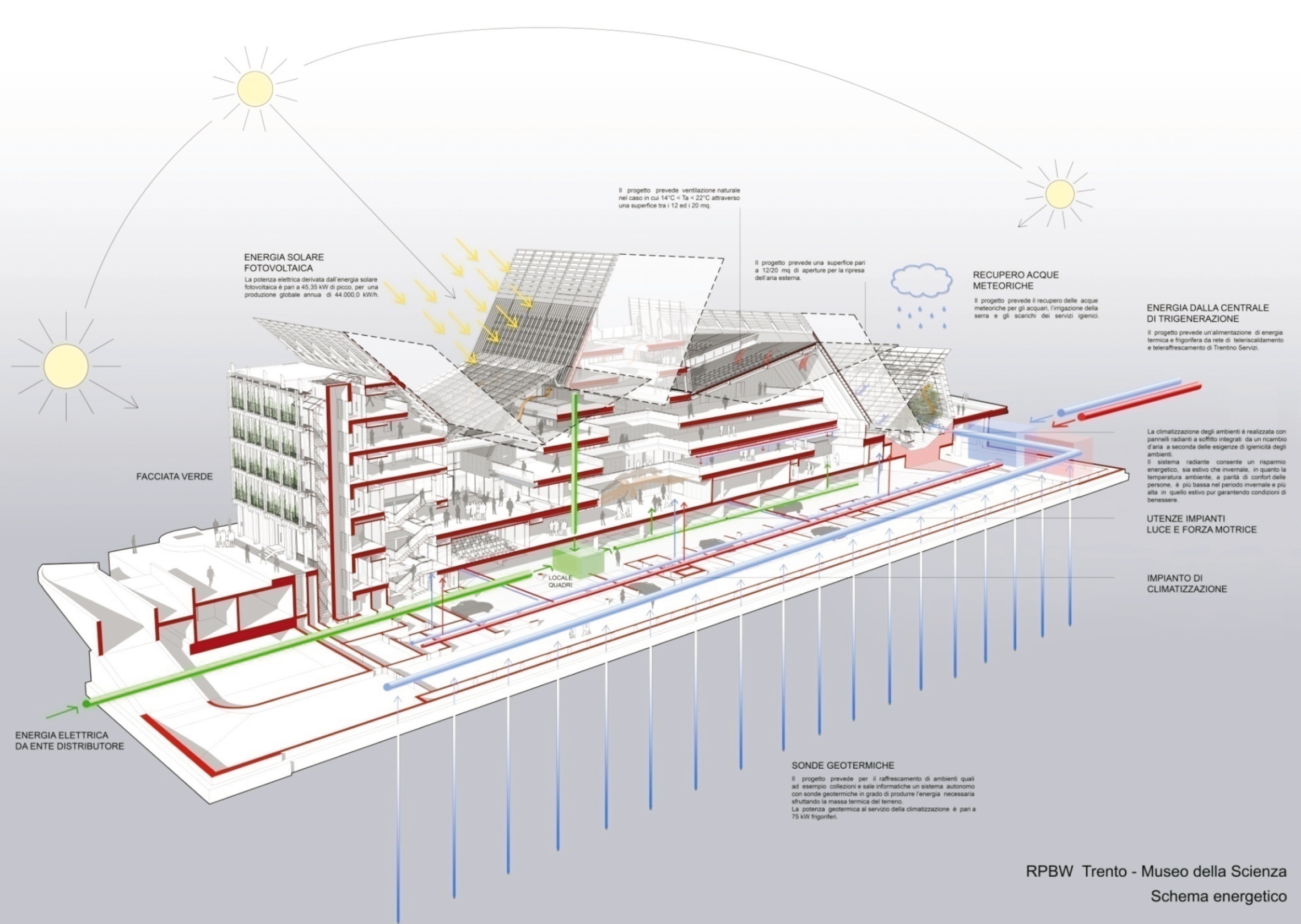 Fonti energetiche rinnovabili saranno infatti impiegate in impianti ad elevate prestazioni: sono previsti sistemi di tri-generazione, celle fotovoltaiche e sonde geotermiche che garantiranno una potenza elettrica pari a 950 kW, una potenza termica di 1180 kW e una potenza frigorifera pari a 1450 kW.