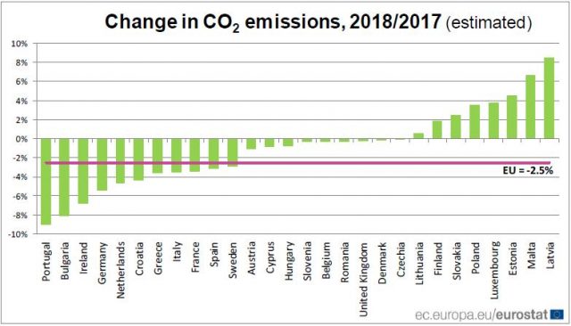 L’Eurostat, l’ufficio statistico dell’Unione europea, stima che nel 2018 nell’Unione Europea le emissioni di anidride carbonica (CO2) derivanti dalla combustione di combustibili fossili siano diminuite del 2,5% rispetto all’anno precedente…continua