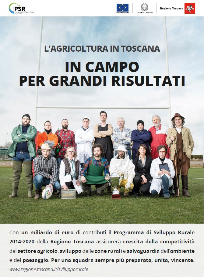 Un breve messaggio spiegherà poi che quasi un miliardo di euro sarà investito in Toscana per assicurare crescita della competitività, sviluppo delle zone rurali e salvaguardia dell’ambiente. "Per una squadra – conclude la campagna – sempre più preparata e vincente."