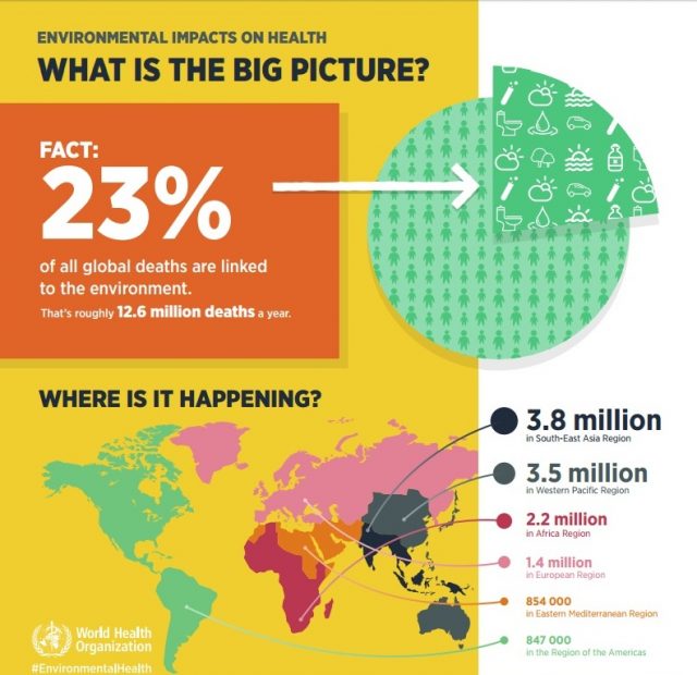 Si stima che nel mondo 12.6 milioni di morti siano attribuibili all’inquinamento ambientale. Secondo il nuovo rapporto dell’Organizzazione Mondiale della Sanità, 1 morte su 4 a livello mondiale è determinata da fattori di rischio ambientale legati al luogo in cui si vive o si lavora. In Europa, nel 2012, l’esposizione a fattori di rischio ambientale è costata la vita a 1,4 milioni di persone.