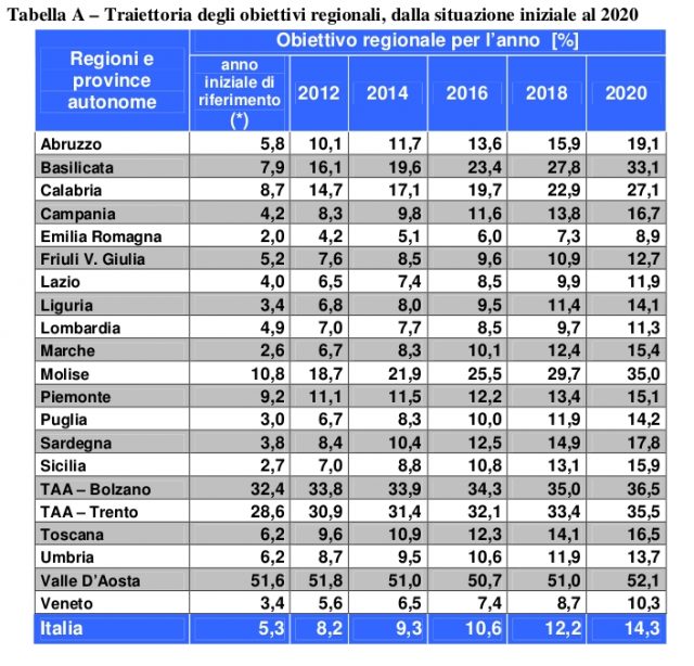 Questo obiettivo per l’Italia corrisponde al 17% di energia da rinnovabili sul totale dell’energia consumata e per le regioni significa raggiungere –collettivamente- una copertura dei consumi energetici nazionali da FER pari al 14,3%.
