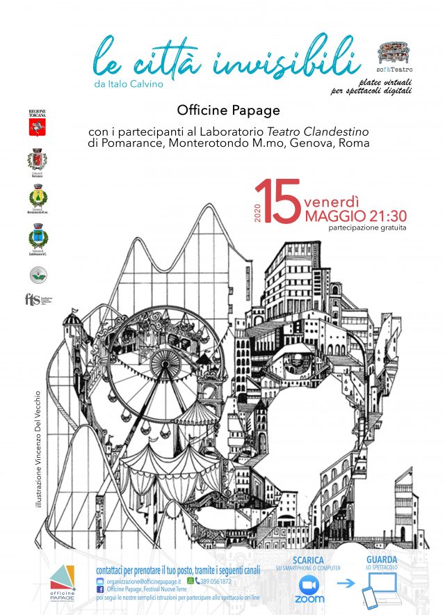 Dopo Piccoli esercizi di Resistenza (24 aprile) e Delitti esemplari 2 (2 maggio), gli attori professionisti e non professionisti del Laboratorio Teatro Clandestino di Officine Papage porteranno in scena sulla piattaforma digitale Zoom lo spettacolo Le città invisibili, dedicato al capolavoro omonimo di Italo Calvino. A una selezione dei testi dell’autore si mescoleranno le creazioni originali dei partecipanti.