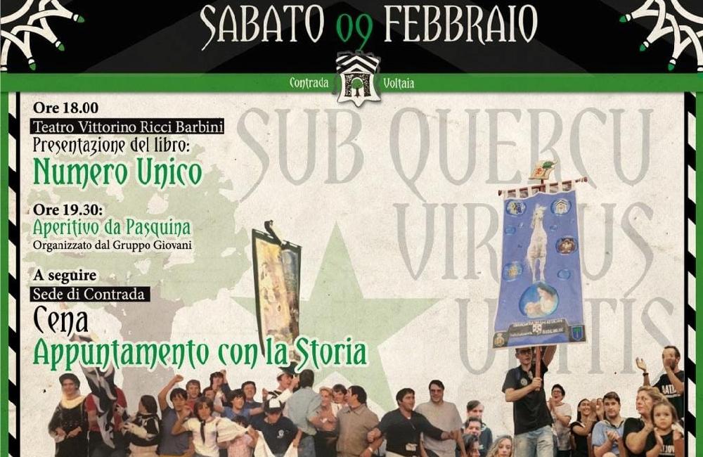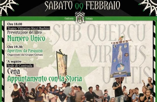 Si terrà sabato prossimo 9 febbraio (ore 18) la presentazione del libro “Numero unico” della Contrada di Voltaia. L’appuntamento, che doveva tenersi lo scorso 26 gennaio ma rinviato per un lutto che ha colpito esponenti della dirigenza, è presso il Teatro Comunale V. Ricci Barbini, situato nel territorio della Contrada, in Via XX Settembre, già Via di Voltaia…(continua)