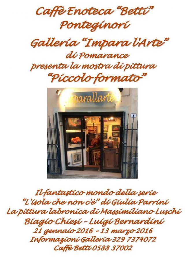 Dal 21 Gennaio al 13 marzo 2016, presso il Caffè Enoteca Betti di Ponteginori, la galleria "Impara l’arte" di Pomarance presenta la mostra di pittura "Piccolo Formato".