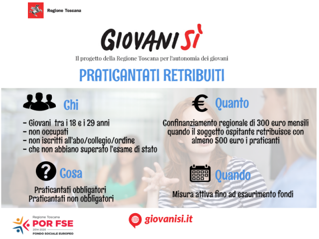 Per favorire l’accesso alle professioni ordinistiche di giovani under 30, la Regione Toscana, nell’ambito del progetto Giovanisì, promuove lo svolgimento di praticantati retribuiti.