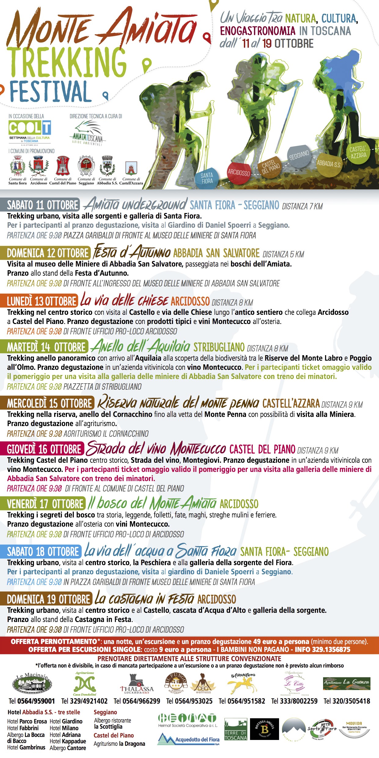 Domenica 12 ottobre, il festival prosegue ad Abbadia San Salvatore in occasione della Festa d’Autunno. Partenza alle 9 e 30 dal museo delle miniere di Abbadia, visita al museo, passeggiata di trekking di 5 chilometri nei boschi dell’Amiata, rientro in Paese e pranzo alla Festa d’Autunno.