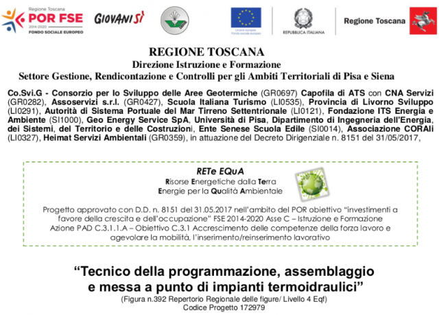A quasi un anno dalla sua conclusione, infatti, per il corso di formazione “Tecnico della programmazione, assemblaggio e messa a punto di impianti termoidraulici” facente parte del progetto RETe EQuA “Risorse Energetiche dalla Terra: Energie per la Qualità Ambientale” (Edizione di Siena) arriva la comunicazione dela concessione di un bonus economico extra da parte della Regione Toscana.
