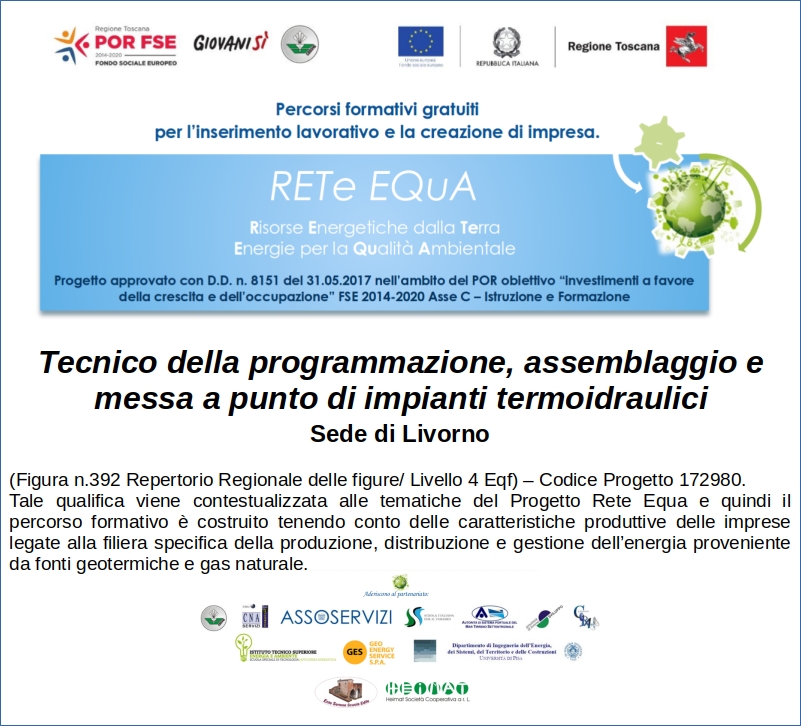 Il percorso è parte del più ampio progetto denominato ‘RETe EQua’ – Risorse Energetiche dalla Terra Energie per la qualità Ambientale che prevede l’attivazione sul territorio regionale di corsi formativi interamente gratuiti finanziati con i fondi POR FSE 2014-2020 a cura del Consorzio per lo Sviluppo delle Aree Geotermiche (Co.Svi.G. S.c.r.l.) e di un ampio partenariato.