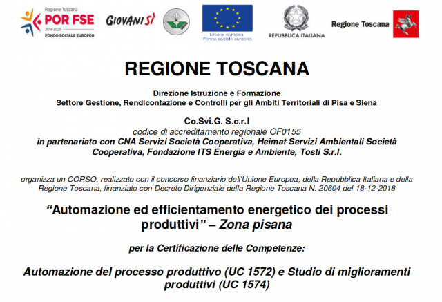È fissata per il 10 ottobre p.v. la data ultima per iscriversi al corso su “Automazione ed efficientamento energetico dei processi produttivi” che si svolgerà presso la sede CoSviG di Larderello, nel comune di Pomarance.