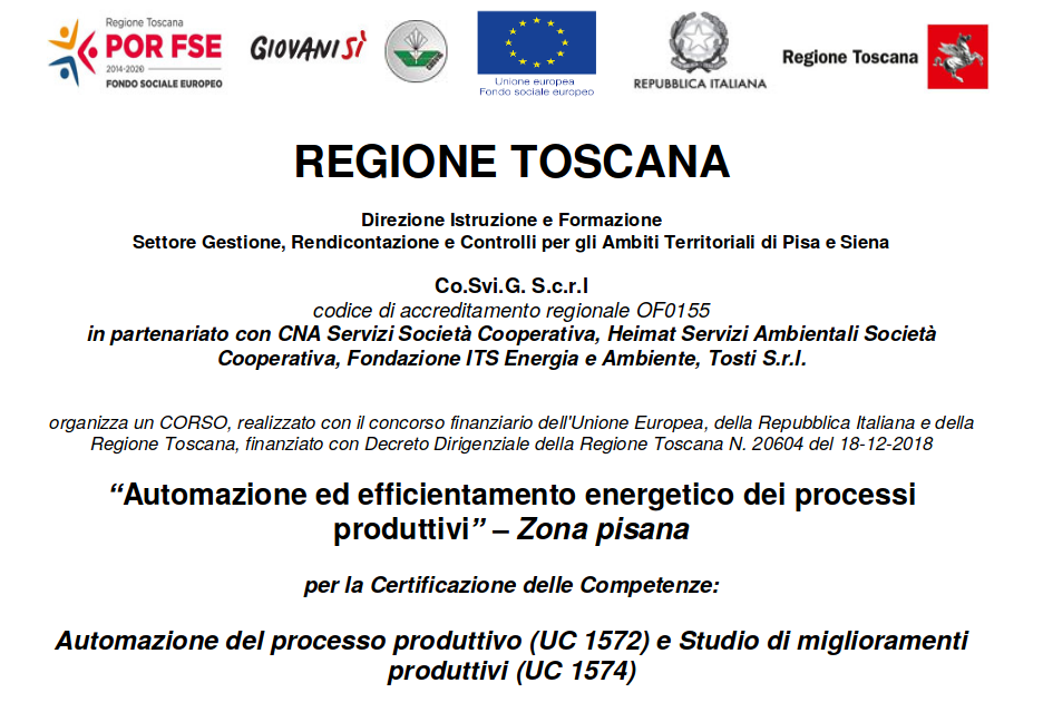 Smart Energy Saving, finanziato tramite il POR FSE TOSCANA 2014-2020 rientra nell’ambito di Giovanisì (www.giovanisi.it), il progetto della Regione Toscana per l’autonomia dei giovani, e si concentra su tematiche estremamente attuali come i meccanismi di risparmio ed efficientamento energetico, in particolar modo in ambiti aziendali e di automazione dei processi produttivi.