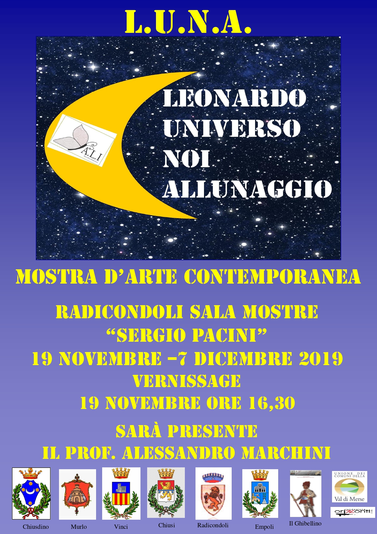 Si terrà Martedì 19 Novembre prossimo, presso la Sala Mostre “Sergio Pacini” di Radicondoli (SI), a partire dalle 16.30, il vernissage della mostra d’arte contemporanea “L.U.N.A. – Leonardo Universo Noi Allunaggio”.