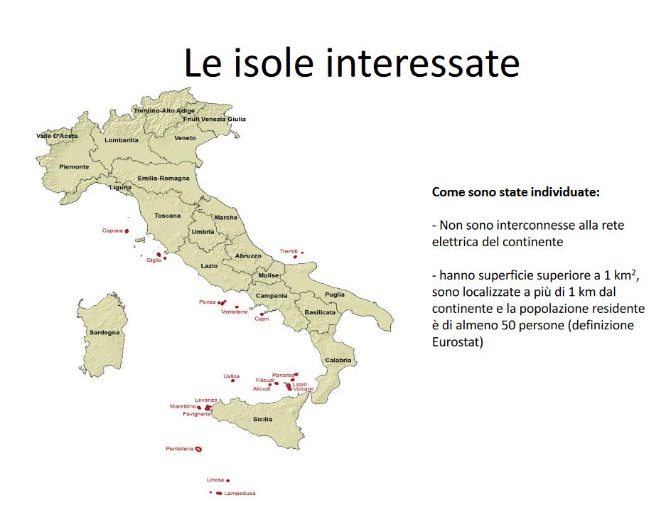 Le isole minori coinvolte dal provvedimento – dettaglia il MISE – hanno superficie superiore a 1 km2, sono localizzate a più di 1 km dal continente e la popolazione residente è di almeno 50 persone. Si tratta delle isole di: Capraia, Giglio, Ponza, Ventotene, Tremiti, Favignana, Levanzo, Marettimo, Pantelleria, Ustica, Alicudi, Filicudi, Lipari, Panarea, Salina, Stromboli, Vulcano, Lampedusa, Linosa e Capri.