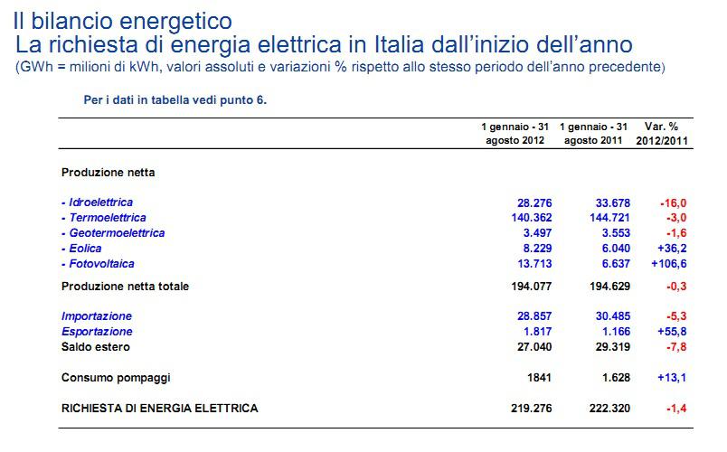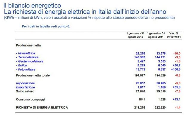 Oltre all’incremento della produzione da fotovoltaico, in aumento su agosto 2011 anche la produzione eolica, pari a 650 GWh (+28,5%) e termoelettrica (+1,1%). In calo la produzione idroelettrica con 3.754 GWh (-5,1%) e identica ad agosto 2011 quella geotermoelettrica.