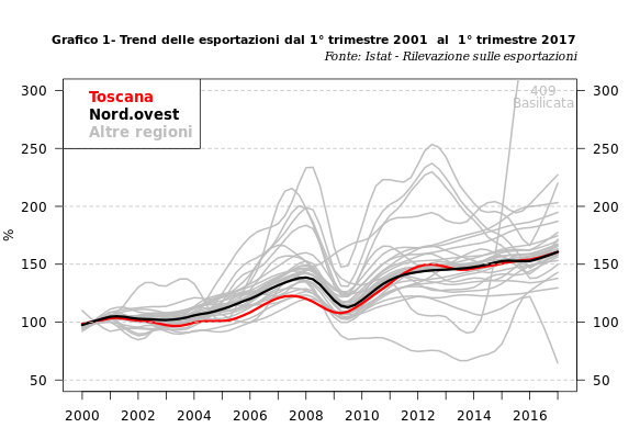 Le esportazioni della Toscana nel primo trimestre (gennaio-febbraio-marzo) del 2017 crescono, rispetto allo stesso trimestre 2016, confermando l’andamento positivo dell’ultimo periodo e recuperando in parte quanto perduto con la crisi.
