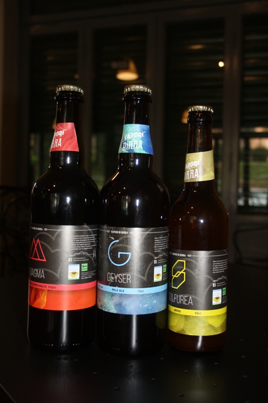 L’originale Birrificio geotermico fa parte della Comunità del Cibo a Energie Rinnovabili del Co.Svi.G che conta numerose aziende agricole locali: dalle serre di basilico e fiori ai caseifici, dalla stagionatura dei salumi agli allevamenti, queste realtà utilizzano le peculiarità del calore reso disponibile dal vapore geotermico per ottenere produzioni di assoluta qualità che si sono guadagnate anche l’accesso a EXPO 2015 tra le dieci buone pratiche selezionate dalla Toscana. Nello stabilimento di produzione di “Vapori di Birra”, all’interno del quale sorge anche un’apposita saletta adibita a pub/ristorante per una serata con gli amici o cene di degustazione a tema, vengono prodotti tre tipi di birra dai cui inconfondibili nomi si intuisce l’inscindibile legame con le terre geotermiche: a “Magma”, una rossa ambrata doppio malto dal sapore unico; la “Geyser”, una pale ale con 100% malto d’orzo; la “Sulfurea”, una weiss di frumento con schiuma bianca e compatta. Sull’etichetta, accanto alla scritta che compare sulle nuove bottiglie, vi sono i loghi di Enel Green Power e della Comunità del Cibo a Energie Rinnovabili.