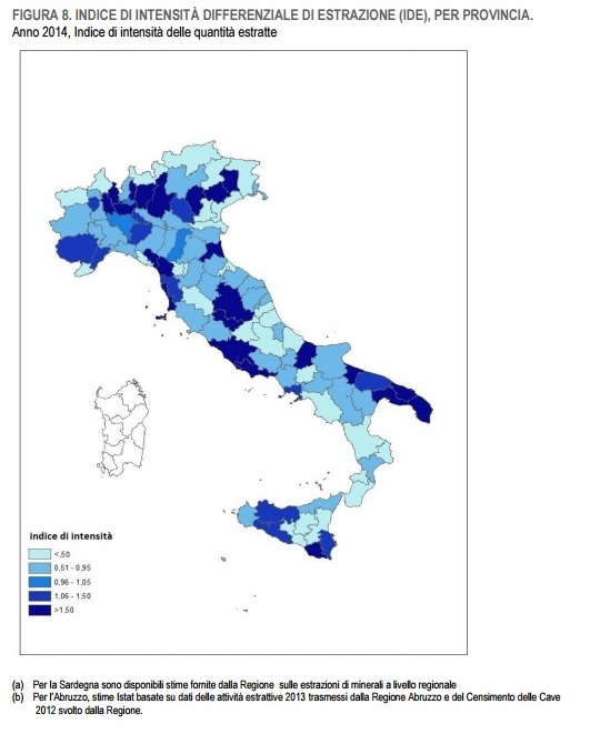 All’elevato numero di siti estrattivi e all’ingente quantità di materiali prelevati si aggiunge infine, come rileva l’Istat, la presenza di due province con elevati valori nell’Indice di intensità differenziale di estrazione (Ide): cosa significa? Tale indice «è dato dal rapporto fra due grandezze: al numeratore le quantità estratte per provincia divise per la superficie provinciale e al denominatore, come base dell’indice, il medesimo rapporto calcolato a livello nazionale. L’indice assume valore uguale a 1 se l’intensità di estrazione provinciale è uguale all’intensità di estrazione media nazionale, mentre valori superiori o inferiori all’unità indicano intensità di estrazione di minerali rispettivamente superiore o inferiore alla media nazionale». Per Massa Carrara l’Ide arriva 5,4, mentre per Livorno sale a 5,9: ovvero un’intensità di estrazione pari a quasi 6 volte la media nazionale.