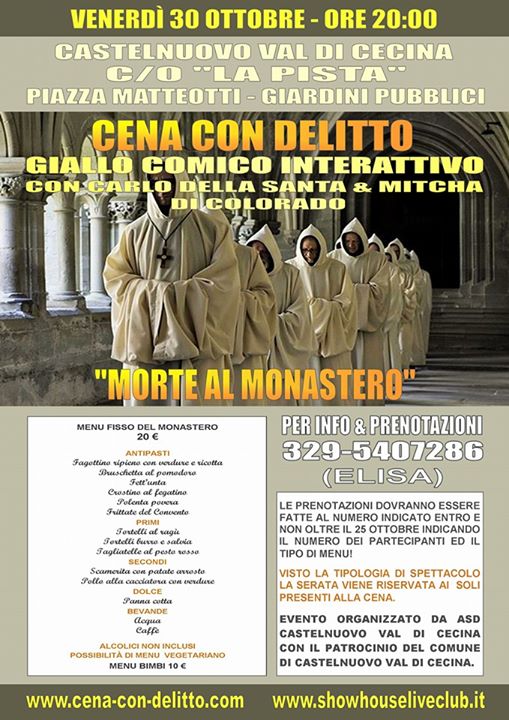 Asd Castelnuovo con il patrocinio del Comune di Castelnuovo Val di Cecina, v’invita a partecipare alla Cena con delitto, che si terrà venerdì 30 Ottobre presso il centro Polifunzionale "La pista" a Castelnuovo Val di Cecina. Per questo evento la cena, che definiscono super, farà solo da cornice a ciò che è stato pensato. Le scenografie che le loro donne ideeranno e lo spettacolo di due comici/attori professionisti, Carlo Della Santa & Mitcha di Colorado Cafè, (e chissà….magari qualche attore lo troveranno anche tra il pubblico?) sarà ciò che stupira’ veramente!