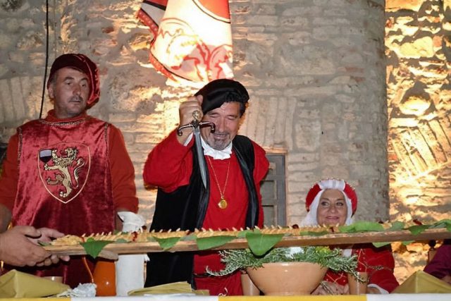 “Nella splendida cornice della Piazza del Castello – declama un ideale banditore – al tramonto del sole, in un’atmosfera d’altri tempi, animata dal suono di musici, giullari e giocolieri della Compagnia dell’Allegra Brigata, si svolgerà la ormai tradizionale cena medievale”.