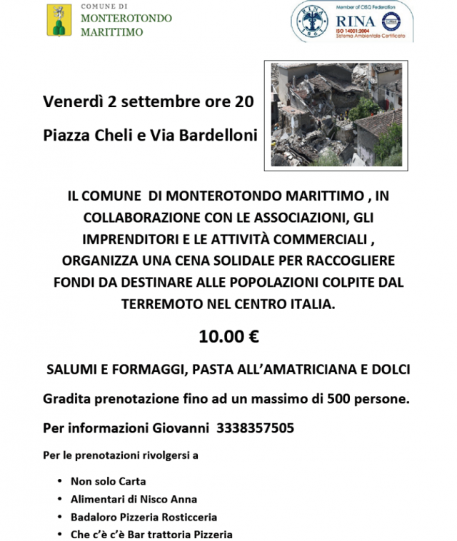 Il Comune di Monterotondo Marittimo in collaborazione con le associazioni, gli imprenditori e le attività commerciali organizza una cena solidale per raccogliere fondi da destinare alle popolazioni colpite dal terremoto del Centro Italia