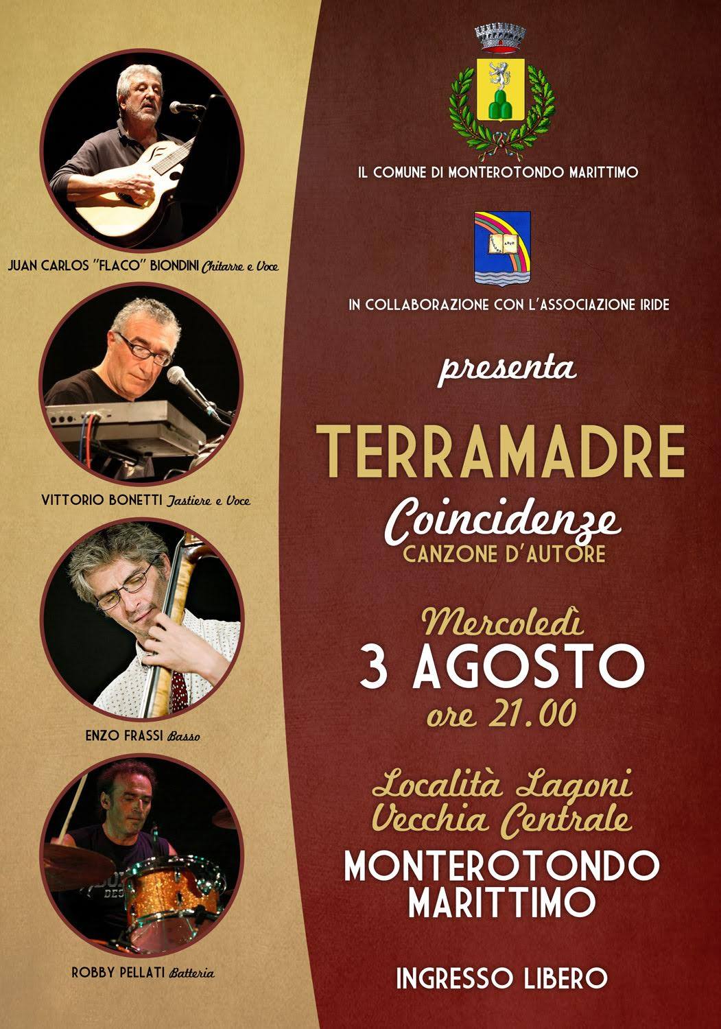 Secondo appuntamento della rassegna estiva al Chiaro di Luna promossa dal Comune di Monterotondo Marittimo: mercoledì 3 agosto, alle 21 e 15, alla vecchia centrale dei Lagoni Boraciferi, si terrà il concerto del gruppo Terra Madre dal titolo Coincidenze. La band è composta da Juan Carlos Flaco Biondini chitarra e voce, Vittorio Bonetti voce e tastiere, Roby Pellati (batterista di Ligabue), Enzo Frassi al basso. Terra Madre si forma nel giugno del 2007 per una serie di coincidenze, appunto. In principio era una band tributo alla memoria di Augusto Daolio, leader indimenticato dei Nomadi, successivamente il repertorio inizia a spaziare su una panoramica completa della canzone d’autore italiana, con brani live di Fabrizio De Andrè, Francesco Guccini, Paolo Conte, Giorgio Gaber, Enzo Jannacci, Pierangelo Bertoli accanto a composizioni proprie. Nel 2009 incidono il CD dal titolo "Coincidenze" che è anche il nome del concerto live che la band presenta da diversi anni. Il sound del gruppo permette di riproporre la canzone d’autore in una veste spesso nuova, ricorrendo ad arrangiamenti che passano con disinvoltura dal reggae al rock, dallo swing al progressive, il tutto correlato da alcune spiegazioni sulla nascita delle canzoni che spesso gettano nuova luce su di esse.