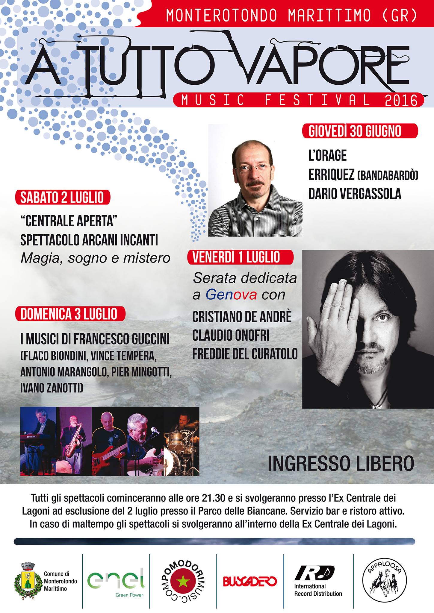 Dario Vergassola, l’Orage, Erriquez della Bandabardò, Cristiano De Andrè, Claudio Onofri, Freddie Del Curatolo e i Musici di Francesco Guccini. Dal 30 giugno al 3 luglio Monterotondo Marittimo fa il pieno di big con “A tutto vapore” il music festival ambientato nel suggestivo scenario ai piedi del Parco delle Biancane tra soffioni boraciferi e geyser. Tutti gli spettacoli, a ingresso libero, inizieranno alle 21 e 30 e si terranno all’ex centrale dei Lagoni Boraciferi destinata a divenire punto di riferimento per gli eventi del territorio. Unica eccezione lo spettacolo del 2 luglio – Arcani incanti – che si terrà proprio all’interno del Parco delle Biancane. La vecchia Centrale e il meraviglioso panorama saranno la cornice perfetta per questa edizione del festival dove la musica avrà sempre un ruolo pulsante ma ci sarà spazio anche per la comicità e la letteratura.