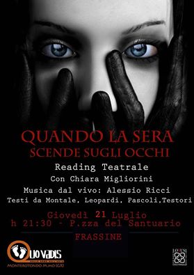 Una voce e una chitarra, una voce e una serie di effetti sonori suggestivi e coinvolgenti che accompagnano il cammino poetico che percorre le parole di autori che spaziano da Pascoli a Foscolo, passando per Montale e Testori. Una riflessione sulla sera, sulla fine di un cerchio che di volta in volta si ripete, ricominciando, una riflessione poetica sulla morte attraverso i versi più belli della letteratura italiana, nella splendida cornice della piazza del Santuario del Frassine.