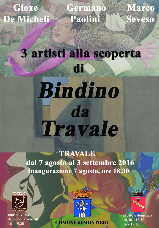 Tre artisti alla scoperta di Bindino da Travale Gioxe De Micheli Germano Paolini Marco Seveso 7 agosto-3 settembre da lunedì a venerdì 16-19.30 sabato e domenica 10.30-12.30 16-19.30