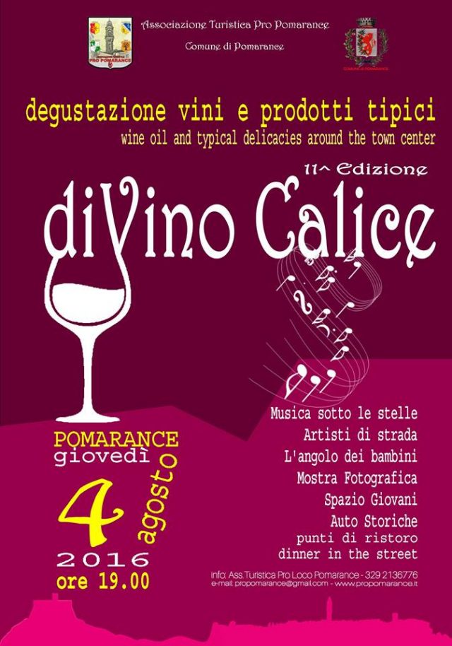 A partire dalle ore 19.00 si terrà a Pomarance la 11esima edizione di DiVino Calice, la manifestazione dedicata alla degustazione di vini e prodotti tipici.