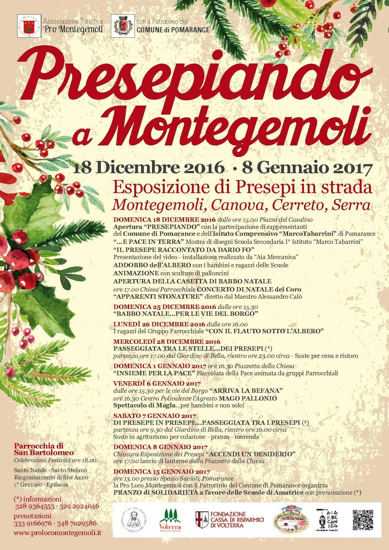 Sono online sul sito del Comune di Pomarance i dettagli relativi a "Presepiando 2016-17", la manifestazione che vede l’esposizione di Presepi in Strada a Montegemoli, Canova, Cerreto e Serra e che si terrà dal 18 Dicembre 2016 fino al 8 Gennaio 2017.
