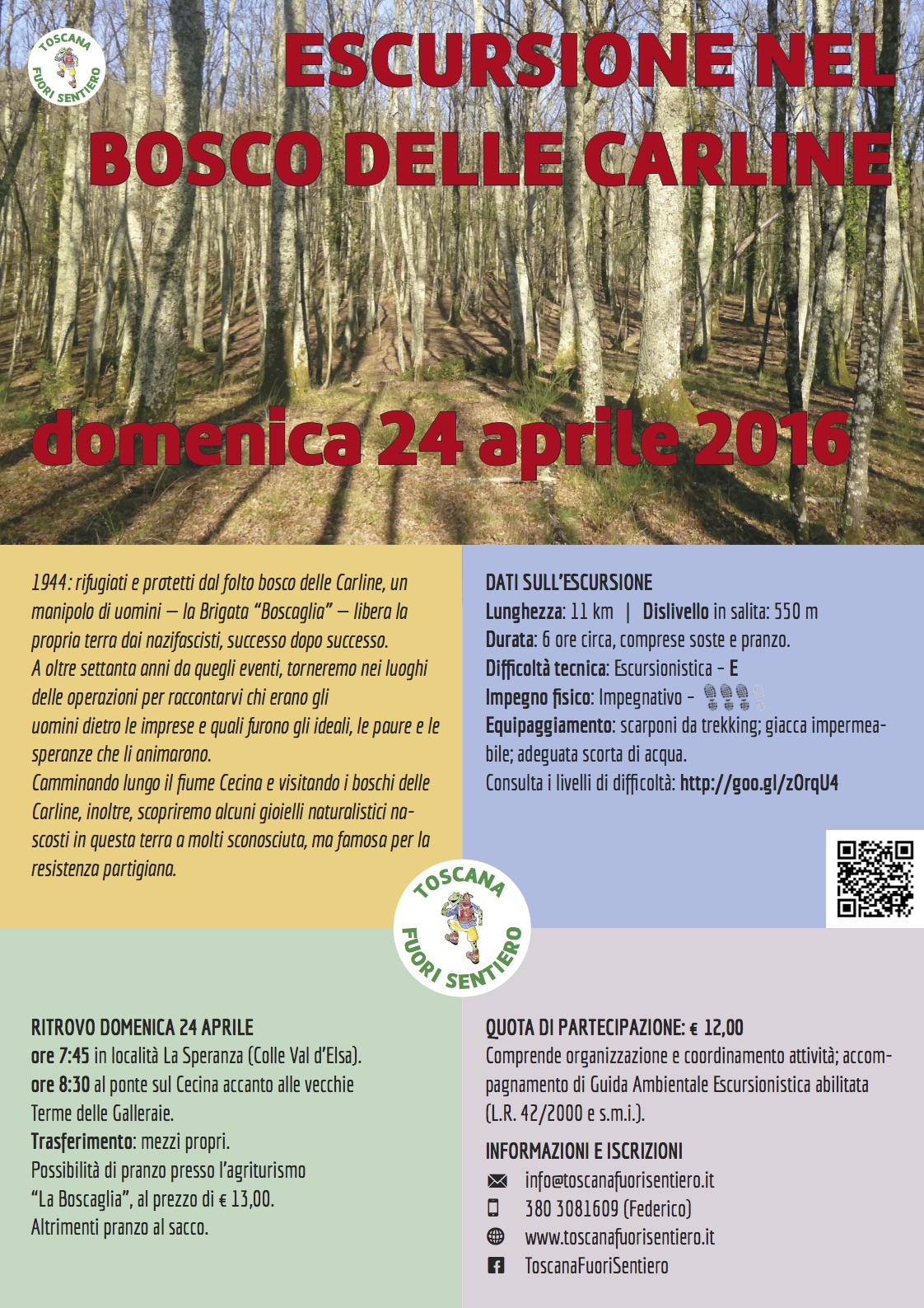 1944: dal bosco delle Carline un manipolo di uomini libera, successo dopo successo, la propria terra dai nazifascisti. Oggi, a oltre settanta anni di distanza, vi racconteremo chi erano gli uomini dietro le imprese, quali erano le emozioni vissute dietro ai quei nomi. Camminando lungo il fiume Cecina e visitando i boschi delle Carline scopriremo alcuni gioielli naturalistici nascosti in questa terra sconosciuta a molti, ma famosa per la resistenza partigiana.