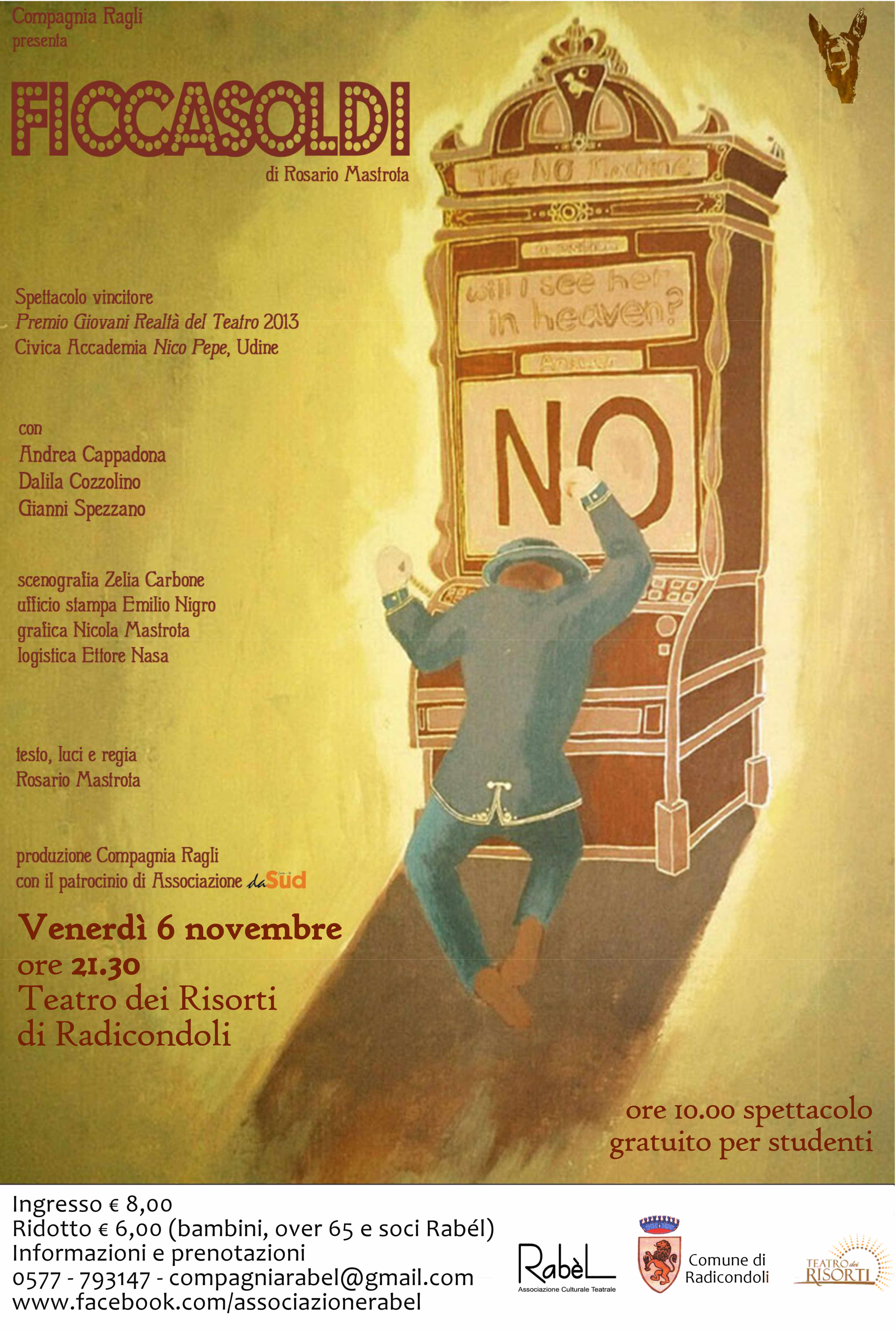 Ettorino, un barista, ha accolto nel suo bar diverse slot machines: in tempo di crisi fare solo caffè non è molto retributivo. Qualcuno ritorna spesso, qualcuno è di casa. Un uomo senza nome, per noi Ficcasoldi, vive la deteriorante ascesa della ludopatia, l’erosione dell’autocontrollo, l’impossibilità di venirne fuori, ficcando la sua vita, pezzo dopo pezzo, nella macchinetta infernale. L’ebbrezza del gioco apparirà più fragile dell’altra malattia celata nel bar: un’organizzazione malavitosa gestisce quel business, trasformando le slot in casseforti di denaro da riciclare. Ficcasoldi è uno spettacolo che inquadra, nel particolare, un male universale, quello di una società, vittima di una crisi celebrata, che cede alle lusinghe del “vincere facile”.