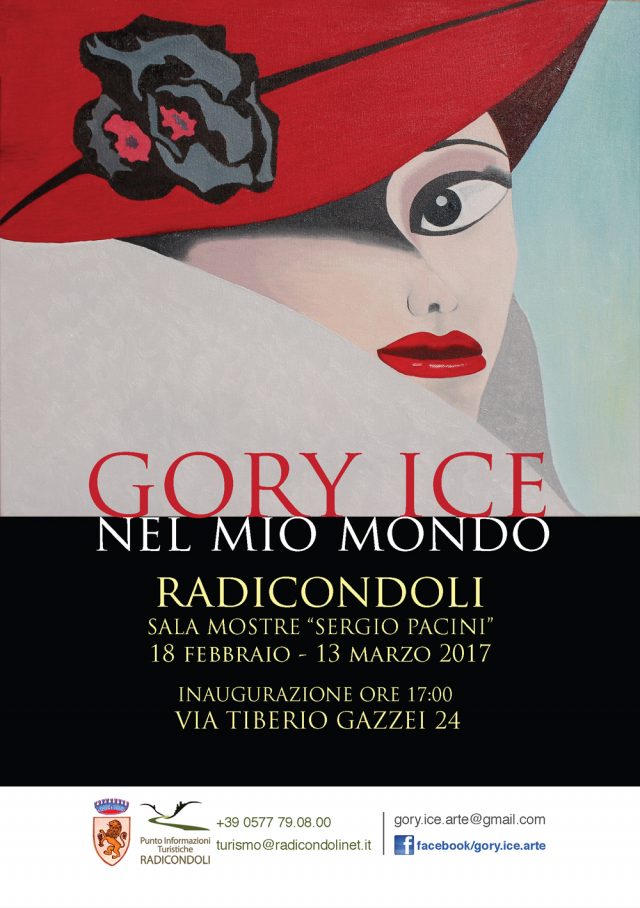 Sabato 18 febbraio alle ore 17.00 si inaugura a Radicondoli, presso la sala mostre "Sergio Pacini" di via Tiberio Gazzei 24, la mostra di Gory Ice "Nel mio mondo", grazie alla collaborazione tra l’Amministrazione comunale e l’Ufficio turistico. I dipinti resteranno esposti fino al 13 marzo.