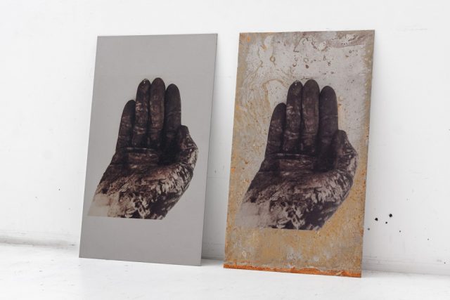 – Hand, 2014, stampa su ferro ossidato Dittico, 36×21,5 cm. (ciascuna)