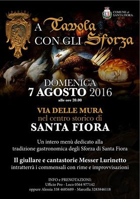 Domenica 7 agosto ore 20.00 via delle Mura – nel centro storico di Santa Fiora. Un intero menù dedicato alla tradizione gastronomica degli Sforza di Santa Fiora