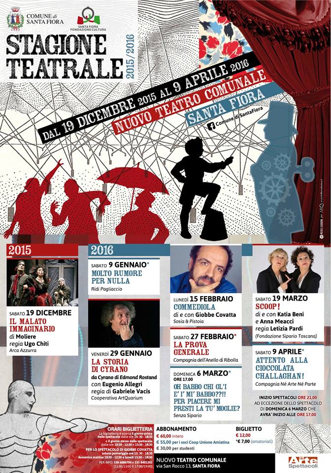 Gli abbonamenti all’intera stagione teatrale sono in vendita alla biglietteria del Teatro – Via San Rocco 13 Santa Fiora – a partire da sabato 28 Novembre con orario 10:30 -12:30 e 15:30 – 18:30