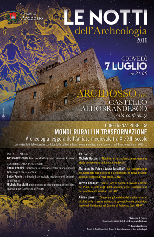 Le relazioni saranno affidate allo stesso Nucciotti che parlerà dei “Mondi rurali in trasformazione: verso una storia archeologica dell’Amiata medievale”, a Marianna De Falco e Laura Torsellini, “La Trasformazione del paesaggio rurale attorno a Stribugliano: gli scavi di Castel Vaiolo e Podere La Pieve (secc. X-XIV). Proseguiranno Teresa Cavallo con la relazione dal titolo “Santa Fiora di Noceto. Gravilona e Castel del Piano: il ruolo degli Aldobrandeschi nella trasformazione del popolo amiatino (sec. XI) e Ambra Ulivieri “Conoscere gli amiatini del medioevo: primi risultati delle ricerche archeo-antropologiche sulle deposizioni medievali individuate nel Comune di Arcidosso (sec. XII – XV).