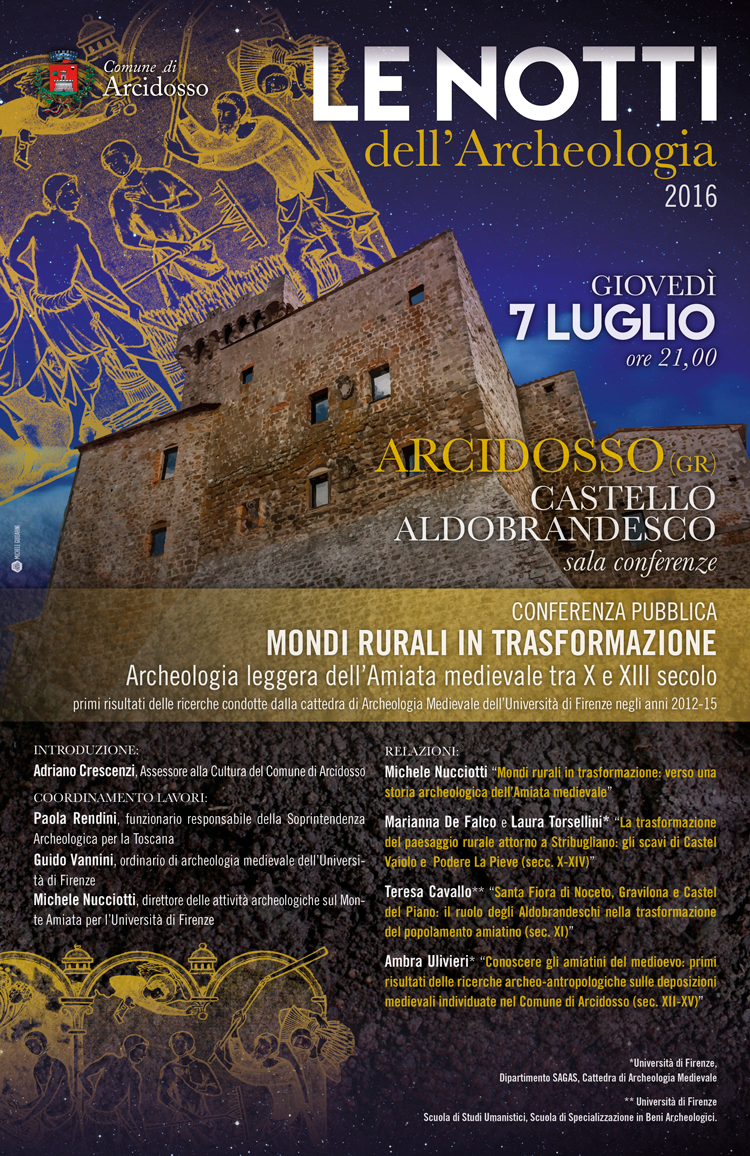 Ad illuminare le notti dell’Archeologia ad Arcidosso, sarà il medioevo. Giovedì 7 luglio, nella suggestiva cornice medievale del Castello Aldobrandesco (sala conferenze), a partire dalle ore 21 saranno presentati i primi risultati delle ricerche condotte dalla cattedra di Archeologia Medievale dell’Università di Firenze negli anni 2012 – 2015.