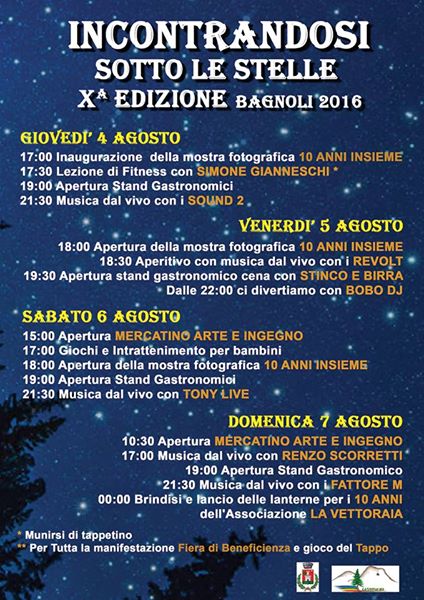 L’Associazione Culturale "La Vettoraia", presenta il calendario delle manifestazioni nell’ambito della X Edizione di "Incontrandosi sotto le stelle".