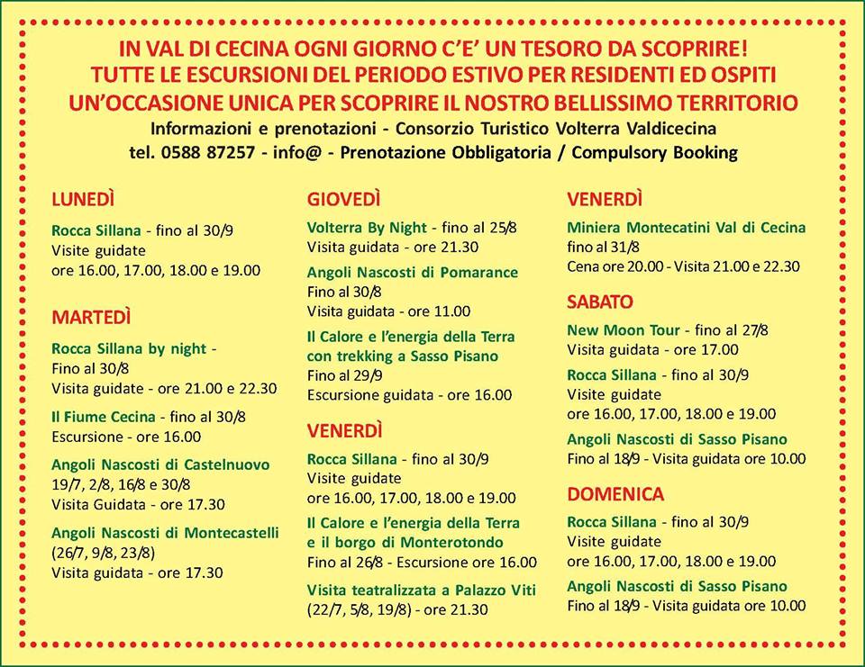 In Valdicecina ogni giorno c’è un tesoro da scoprire! Tutte le escursioni del periodo estivo per residenti ed ospiti. Un’occasione unica per scoprire il nostor bellissimo territorio.